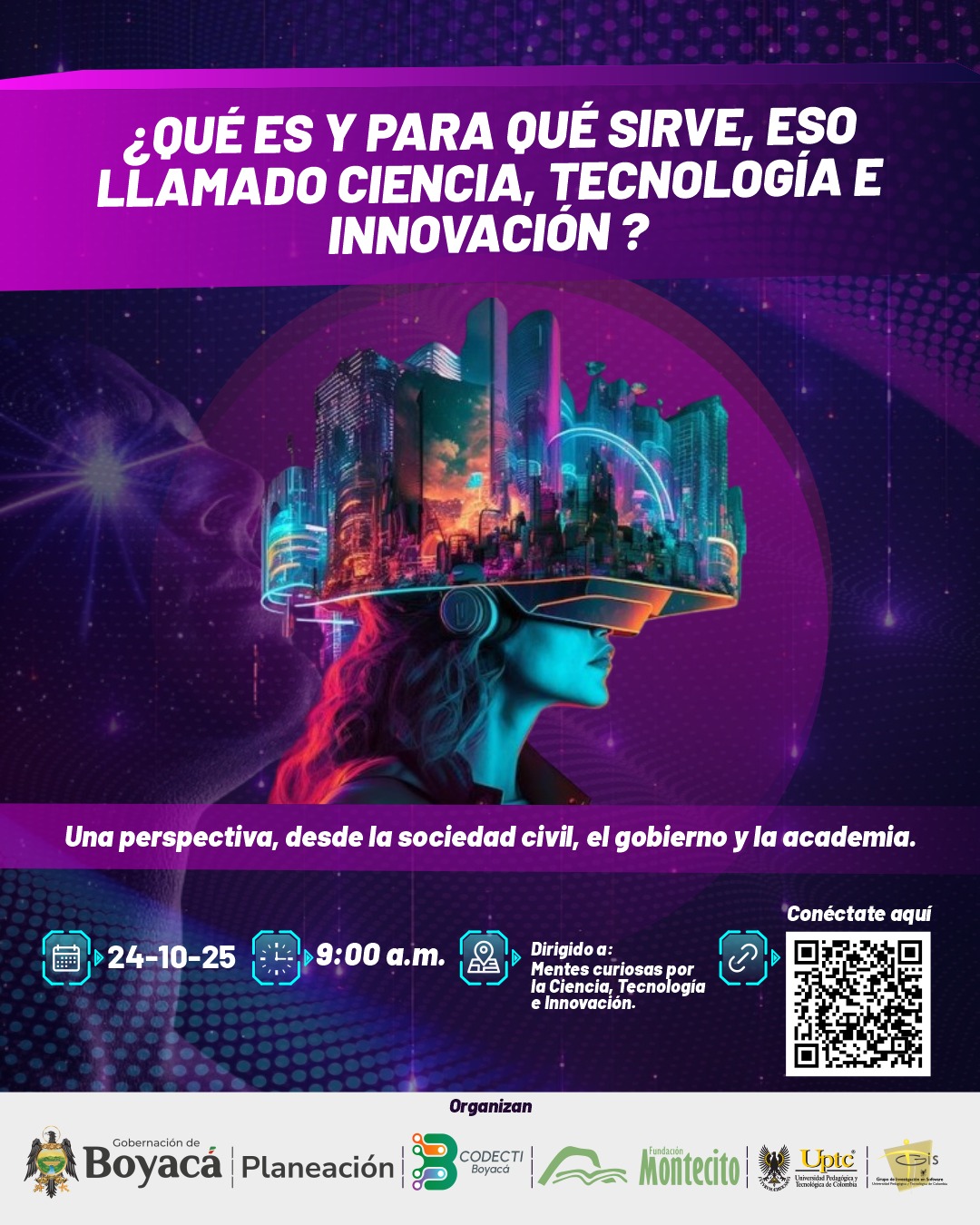 El encuentro, que se llevará a cabo de manera virtual el próximo jueves 24 de octubre a las 9:00 a.m., pretende ofrecer una mirada integral sobre cómo la ciencia, la tecnología y la innovación se conectan con la vida cotidiana, la gestión pública y los procesos académicos, impulsando el progreso sostenible de Boyacá.